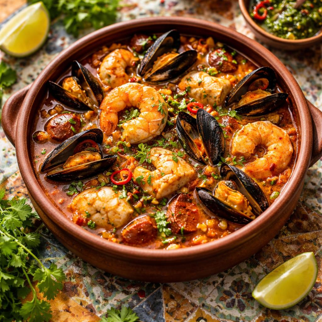 Bubbling clay pot of shrimp, mussels, fish, and chorizo in smoky tomato-chipotle broth