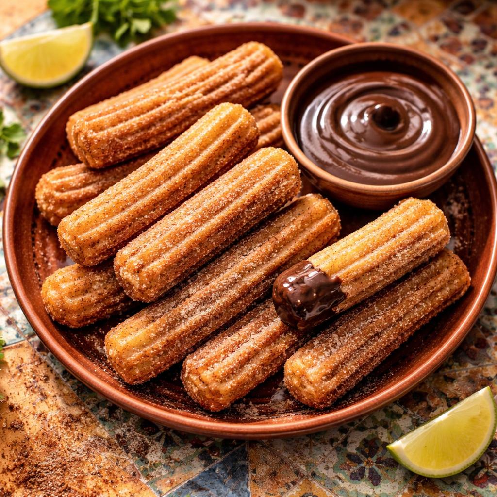 Crispy cinnamon-sugar churros with rich chocolate dipping sauce