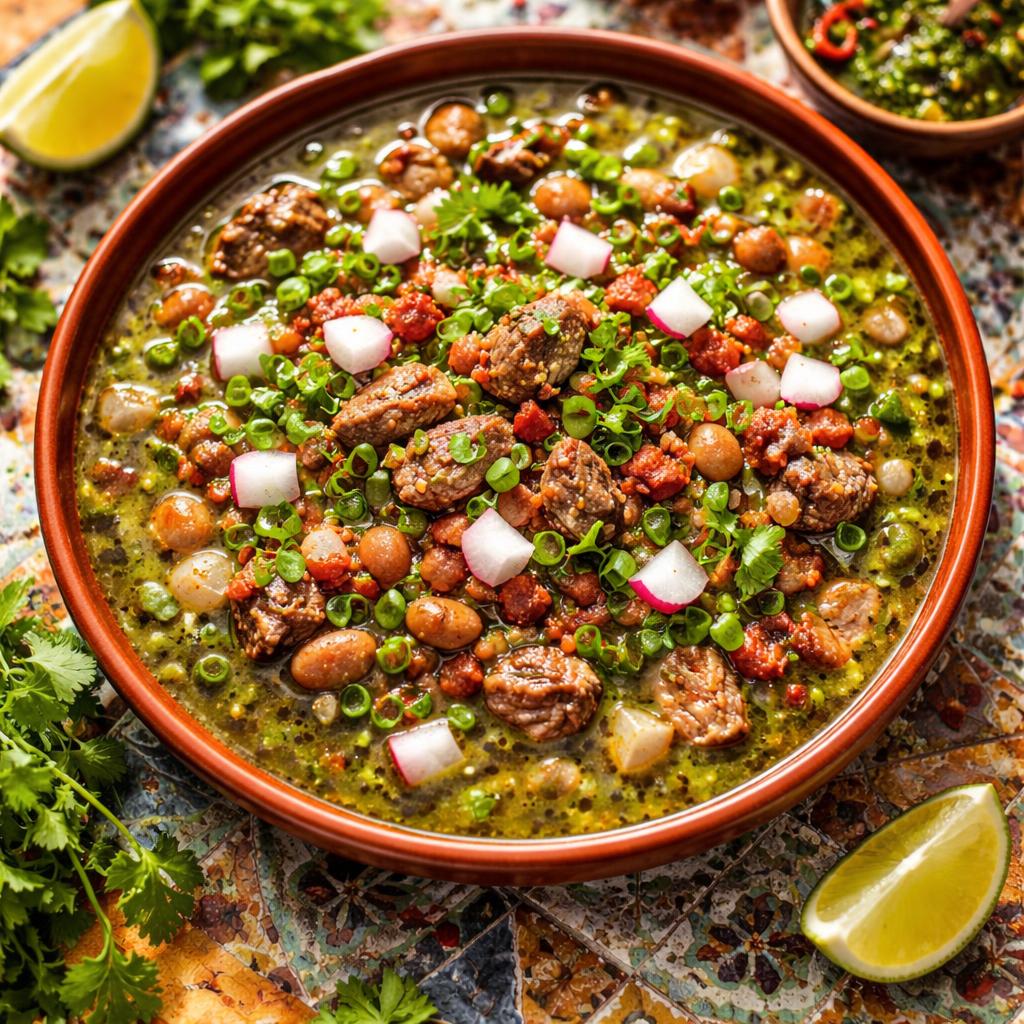Jalisco-style beef stew with flank steak, bacon, beans, tomatillo sauce, cilantro, and radishes
