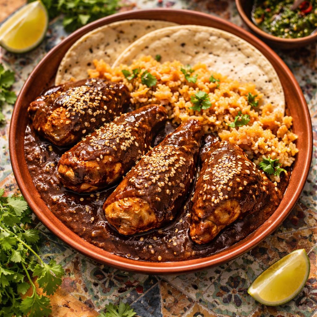 Tender chicken in rich chocolate-chile mole sauce with sesame seeds, served with rice and warm tortillas
