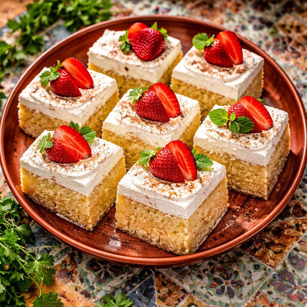 Moist sponge cake soaked in three milks, topped with whipped cream