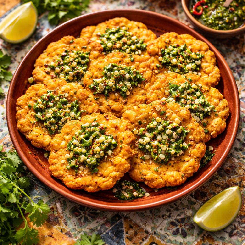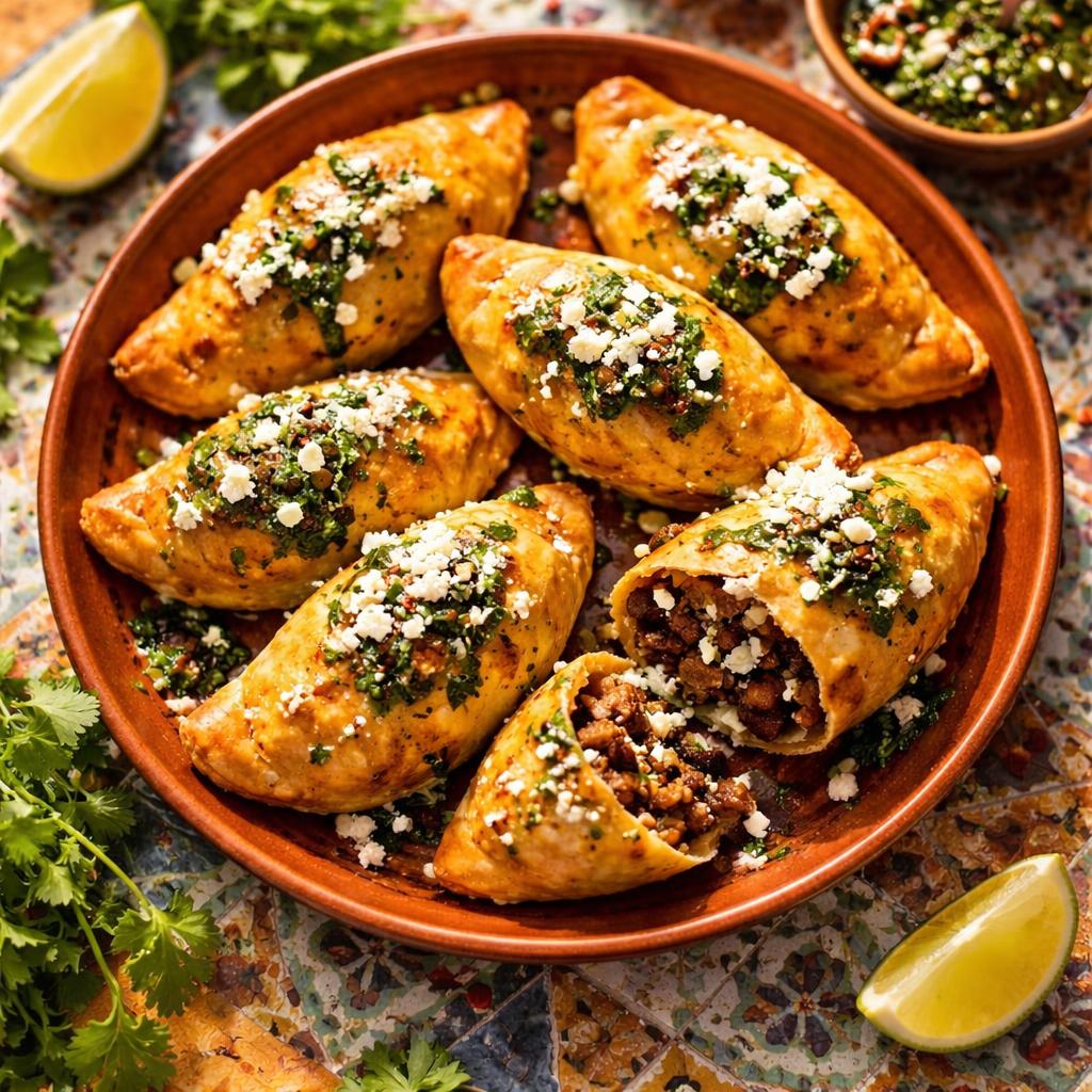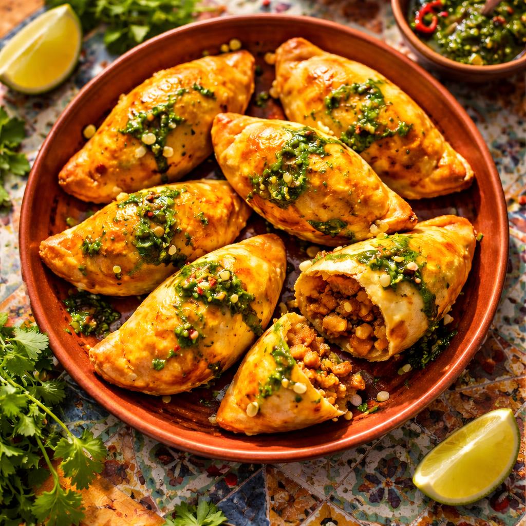 Golden pastries filled with spiced beef, potatoes, and raisins, served with chimichurri sauce