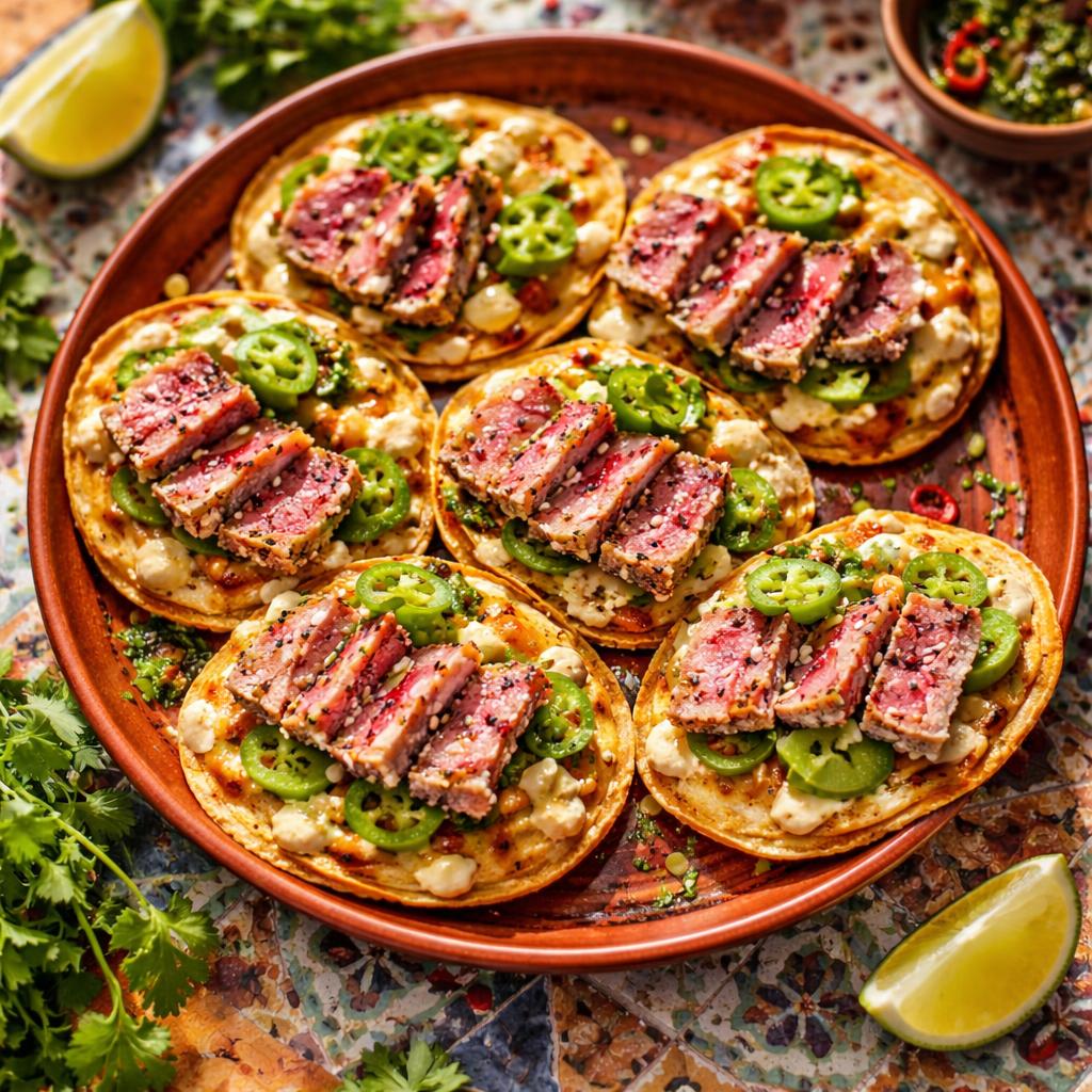 Seared sesame-crusted tuna on crispy tortilla with avocado and chipotle mayo