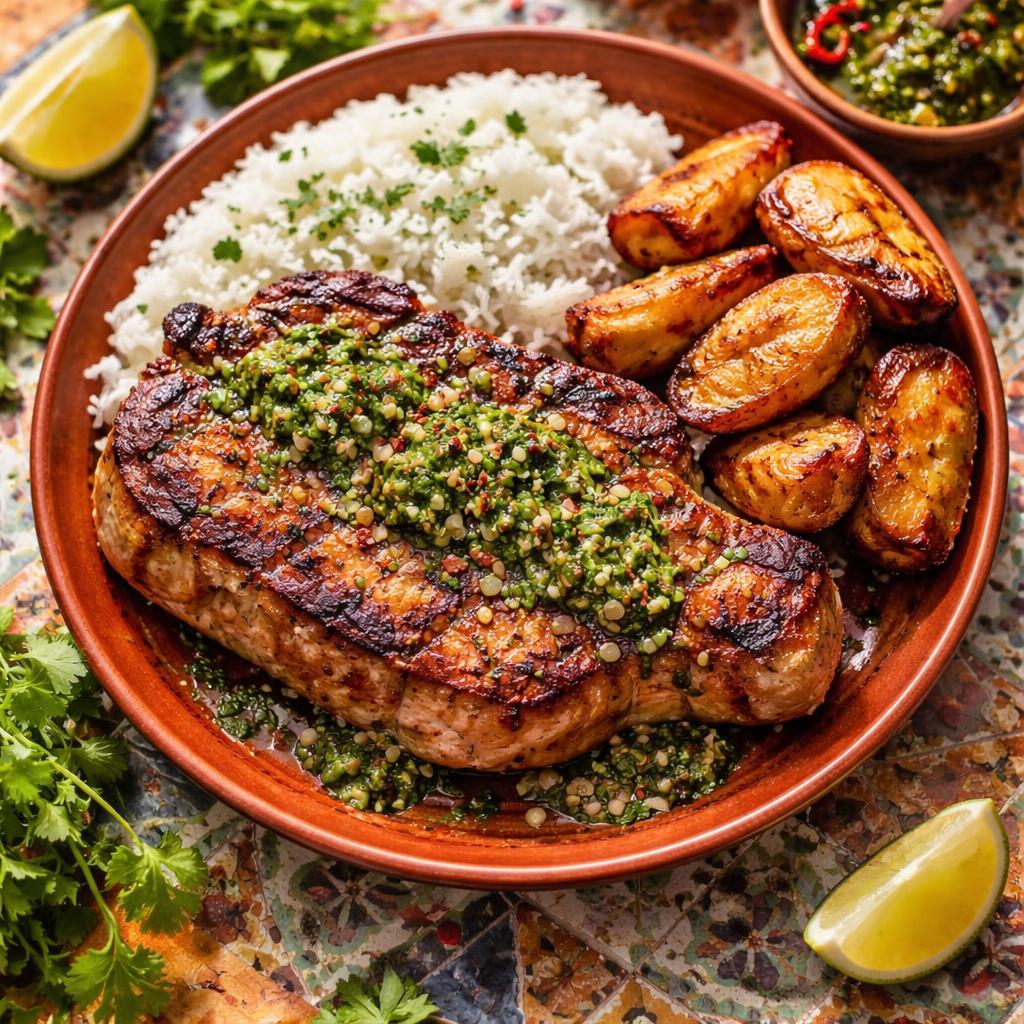 Thick-cut marinated pork chop with chimichurri, served with fried plantains and cilantro rice