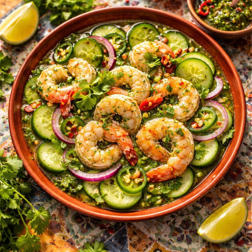Raw shrimp in spicy lime and serrano chile sauce with cucumber and red onion